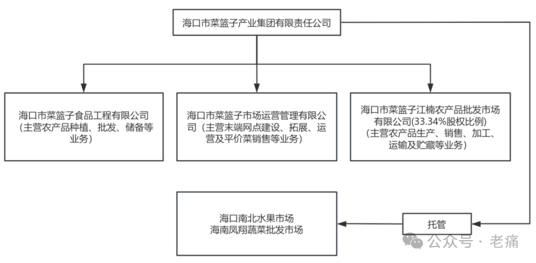 经过十年发展,海口菜篮子集团旗下除了投资设立一些业务公司,同时还有江楠农产品批发市场,托管了海口南北水果市场和海南凤翔蔬菜批发市场等。(见下图)
