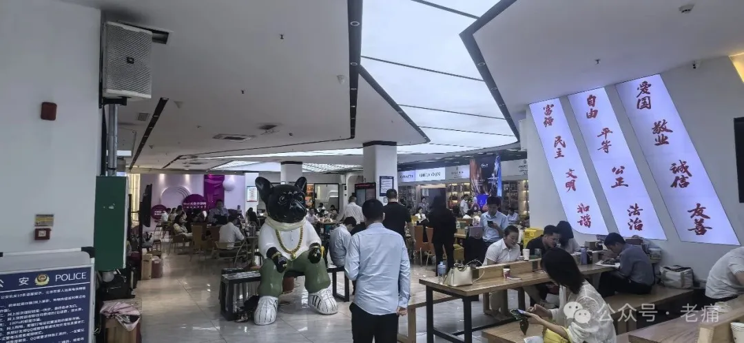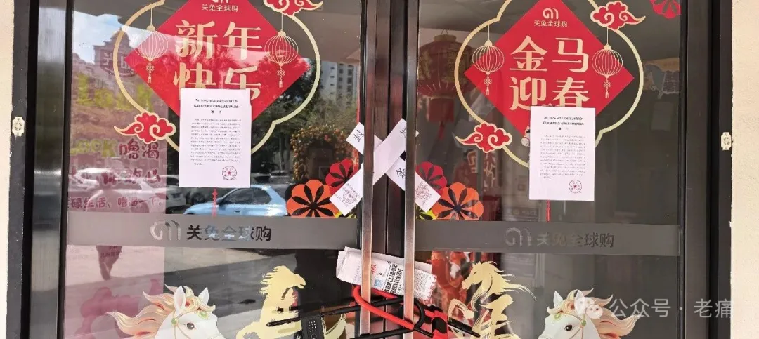 (△看上去正准备热闹过年的“关免全球购”经营场所被贴上了封条。老痛拍摄于2026年2月6日)我恰好在2025年11月6日曾经到访此处,拍了以下照片。从照片中可见,里面的人熙熙攘攘,很多人在用手机做着直播;墙边货架上陈列着一些国外品牌商品;墙上也大大地展示着“社会主义核心价值观”;甚至在入口也非常显眼地摆放着公安部门的提示牌。