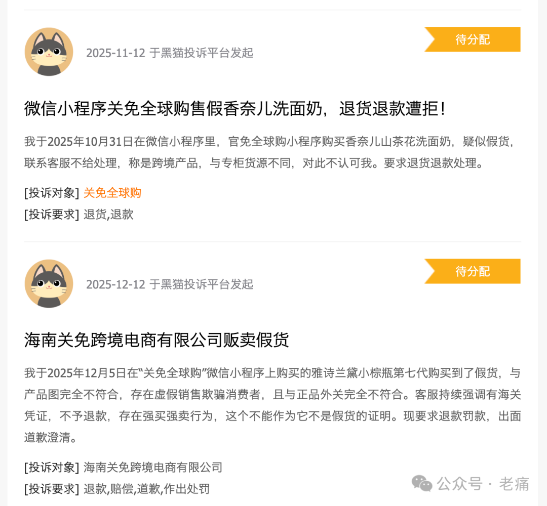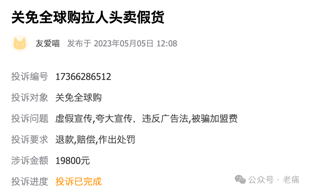 根据上述通告,能知晓的是警方针对“关免全球购”的违法犯罪问题已经立案侦查,对有关犯罪嫌疑人也采取了刑事强制措施;但尚未公开具体是涉嫌什么样的违法犯罪。不过呢,对于“关免全球购”的负面舆论一直都有。其最典型的表达是:拉人头、假卖货、卖假货。比如在著名的黑猫投诉平台上很容易就能看到以下内容: