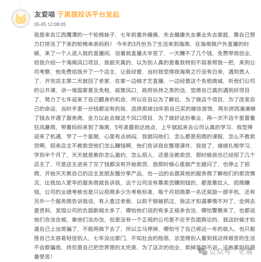 还有一些是投诉平台拒绝退款的。此外,在海口市的12345热线中也能查到有人咨询说“收到海南关免跨境电商有限公司短信,表示成为代理,缴纳代理费999元,可以经营免税店,是否属实?请职能单位核实告知。”很明显,“关免”公司在宣传中很可能故意把跨境电商与免税店相混淆了。这些年以来,类似“关免”这样的公司,在自媒体、短视频平台上一直都在持续轰炸,以“一部手机开通免税店”等话术诱导民众去交钱创业。(见下图)
