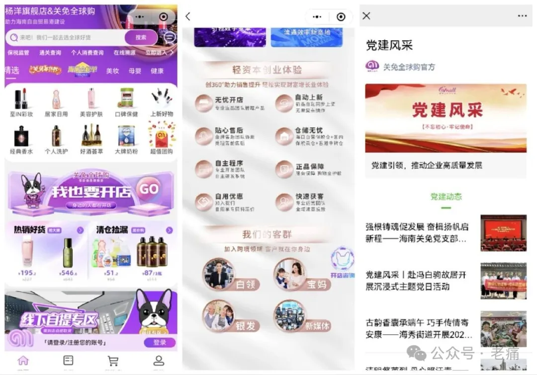 在以上截图中,一位叫“友爱喵”的网友写了一段挺让人心酸的被骗加盟费的故事,其条理很清晰,各位详细看看就很快能看出“关免全球购”的运作模式。总结来说就是当事人在缴纳19800元加盟之后,“关免”工作人员就教她如何拉人头(所谓“招商”)赚钱,而根本不在意卖货的事。这个味很熟悉,这种多层级分销模式就很类似于非法传销。而“关免全球购”确实也是有平台的,有相应的官网、微信小程序、微信公众号等。看上去不光是有货可卖,还在为白领、宝妈、银发一族和做自媒体的人提供“创业服务”。跟他们营业场所中大大地展示“社会主义核心价值观”有着异曲同工之妙的是:“关免全球购”的官方微信号还开设了专门的“党建风采”栏目,发布他们党支部的一些活动内容。(见下图)