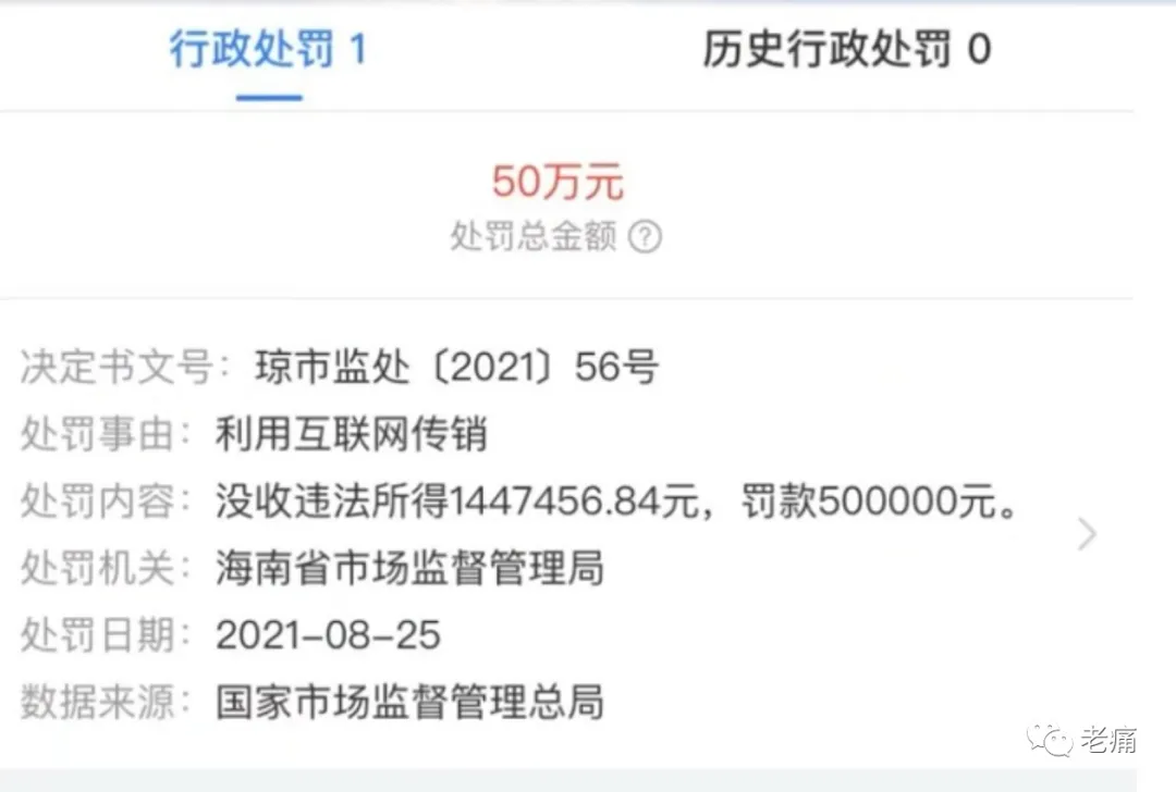 比如前两年在抖音上推广得轰轰烈烈的“壹品大盛国际贸易(海南)有限责任公司”,最后在2021年8月25日被海南省市场监督管理局没收违法所得1447456.84元,罚款500000元。