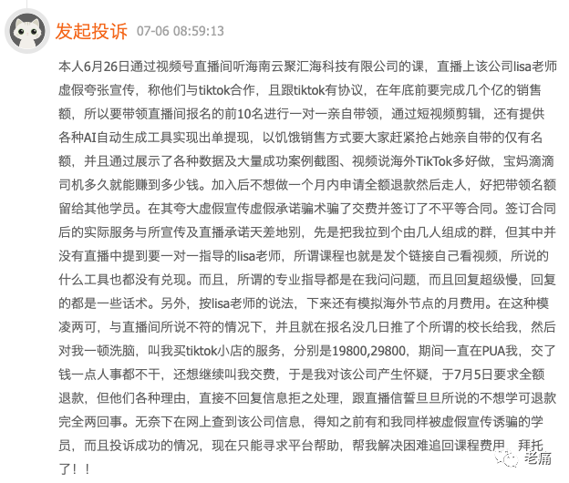 比如在新浪的黑猫投诉上面就看到好几个,均是投诉海南云聚汇海科技有限公司所谓的跨境电商培训的,说他们虚假、夸大宣传,并且不愿意按照原来说的条件退费。在黑猫投诉平台上,关于这家公司的投诉较多。其套路也比较简单,就是利用短视频平台拉客,然后收培训费。