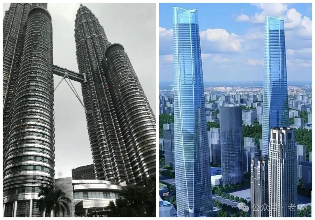 上图左部是吉隆坡双子塔,其正式名称为吉隆坡石油双塔(Petronas Twin Towers),1993年动工,1998年竣工,楼高达452米,曾是世界最高楼,至今仍是世界最高双塔楼。该楼的业主方是马来西亚国家石油公司——马来西亚唯一的一个世界500强公司。2017年我第一次到双子塔楼下仰望拍摄,感觉金属感满满、有一种富得流油的感觉,其设计语言确实也很符合马来西亚当地文化特色。